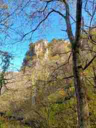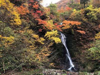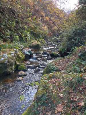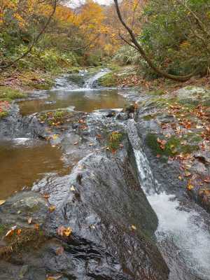 しばらくで、トンビ岩へ登るルートに出会い、なおも少し行くと大池と三蛇滝への道に合流する。 10:29 ここに合流すると人の往来が多いのでこちらがメインルートだと感じた。(石川県側のビジターセンターからの) 右折して下り、三蛇滝へ向かう。 10:32 最下点の川原に広場があり、振り返ると滝だった。 日が差し込むのを少し待ち、写真を撮って引き返す。 |