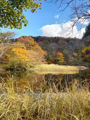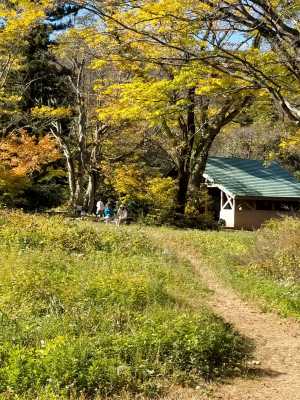 10:59 引き返すと大沼、。開けた大池平に休憩小屋があり。 奇麗なトイレもあった。 池の見える広場の周囲には数か所にベンチがあった。 紅葉見物の小さな子供連れの家族や 多くのハイカーが行き来する。 案外気軽に来られる場所と感じた。 |