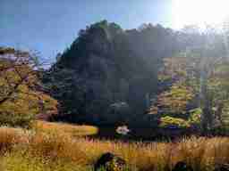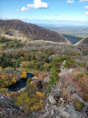 大池。 写真を撮っているとトンビ岩を登ってくる人が下に見える。 数組が登り付き(怖かった〜)と言って通過してゆく。。 |