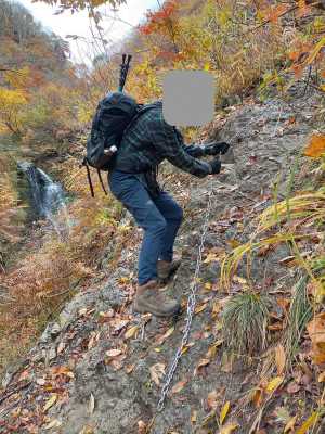 そこから川に沿って、岩壁の片斜面に付けられたルートを行く。カニの横這(よこばえ)と呼ばれている。 川底よりも15m〜20m位の高度を保ちつつ、鎖が付けられている。 濡れていると足元が滑るので要注意! 約70m位続く。 |