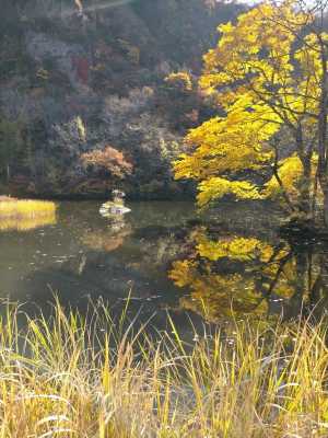小屋前は大池。湖面が日を受けて輝いている。 紅葉した景色を水面に映している。 |