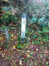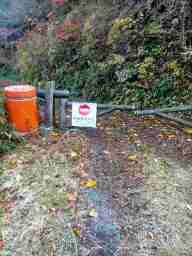 そのヒュッテの先、朝霧峠方面に向かうと10台近く停車可能な登山口がある。 既に6台の停車があった。 金山峠登山口である。 9:11 そこから三千坊山を左に国見平の水平道を大きく回り込むと梯子坂の急坂に出る。 梯子坂と呼ばれるだけあって急斜面の下りだ。、溝になった階段状の斜面をロープにつながりながら滑らないように注意して下る。 |