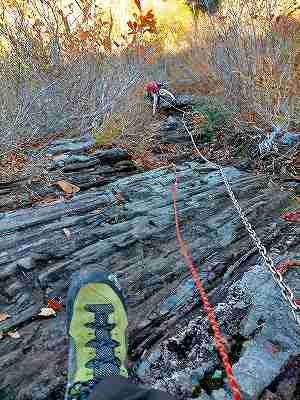 11:00 トンビ岩の取りつき地点 先に登山口に着いて上を眺めていた単独の女性は諦めて戻って行った。 前回はここの登りを避けて周回したので今回は挑戦! と言っても鎖があって、足場やホールドもあり問題はない。 ただ、日影で斜面が濡れているので、念のためにロープを出して安全に登った。 |