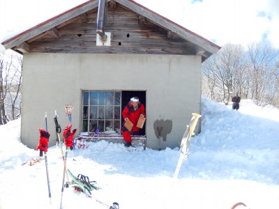 最後の急斜面を登り切ると平坦になり尾根に出た。 標高648mで尾根をたどると五万石道路の医王権現 に出る。 その方向に100m位行くと避難小屋があって、先着いていた仲間が小屋前にピットを掘っていた。 私は藪の急斜面を大汗をかいて大苦戦。一部板を担いで登るがまるで木登りだった。皆に10分程遅れて到着。 646m地点の避難小屋 |