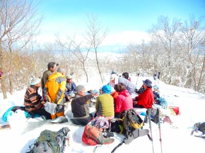 11:40 早速宴会開始。 砺波平野が見事に眺められてロケーションは良い。 いろいろな食材が雪のテーブルの上に並ぶ。 早速乾杯! 小屋の中で大汗で濡れた衣類を乾かすのにしばらくストーブの前で暖を取る。居合わせた福光山岳会の皆さんとも会話が弾む。 再び皆のところへ戻り充分に食べて、おなかを満たす。 |