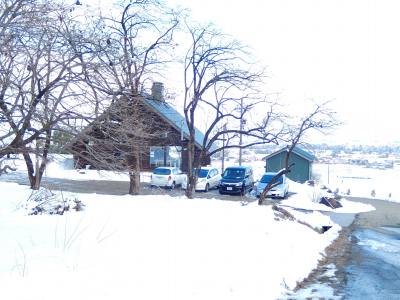 車に戻ると周囲の雪も溶けて路面が出ている。 喫茶店も営業しているのか室内灯が見えている。 |