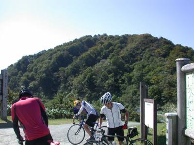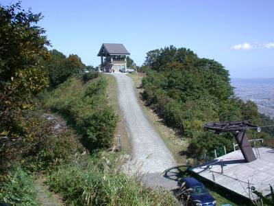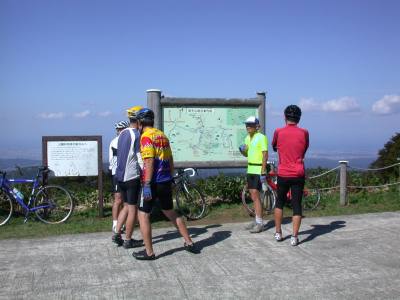 10:23 スキー場のリフトに沿ってぐんぐん高度を上げて 行くとキャンプ場があり、さらに登ると夕霧峠に 着いた。快晴の空で眺望もよく石川県側と砺波野 がよく見える。 峠には展望台とトイレ、無人の休憩所があり すでに10台近くの車があちこちに停車していて 山頂に向かう人々も行き交う。 金沢から1時間30分で来たというサイクリングチームも 登ってきていた。 |