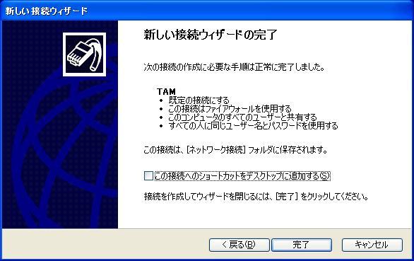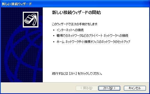 - [スタートメニュー]から[すべてのプログラム]->[アクセサリ]->[通信]->[新しい接続ウィザード]をクリック、[新しい接続ウィザード]を起動させます。