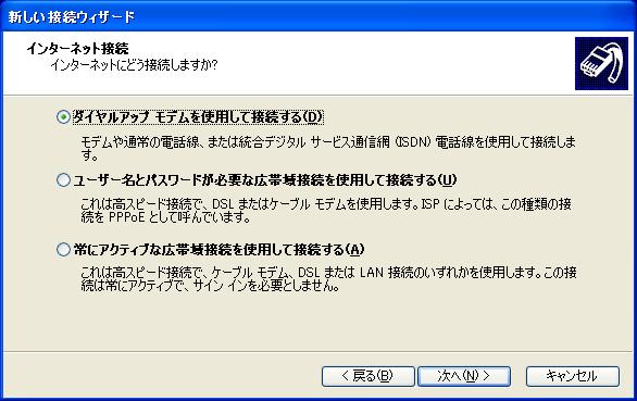 - 『ダイヤルアップモデムを使用して接続する』を選択して、『次へ』をクリックします。