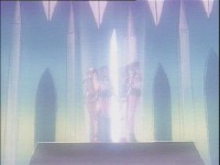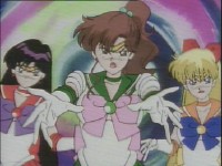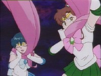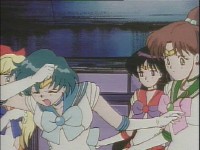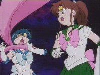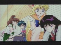 襲われたレイと亜美を助け起こすジュピターとヴィーナス。どちらがどちらを助けるかは既に暗黙の了解か(^^) →