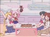 ところで、この直前までまこちゃんはちびうさと一緒にベッドに腰掛けて観戦していたんだけど、実にさりげなく亜美ちゃんの隣に座るようになりましたねぇ。 少ーしずつ進展してます(^^)