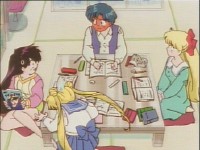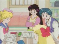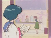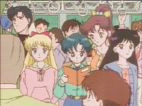 授業中は眼鏡が必要な程の亜美ちゃん。でもまこちゃん視力に関してはとても良かったり(^^; 他の3人は気付かなかったまこちゃんの姿を本を読みながらも発見。心が呼び合ってますな(^^) この投げキスは鏡に写った亜美ちゃんに、という説もあったり。 |